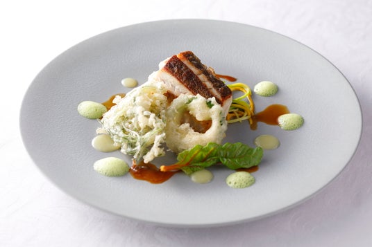 【魚料理】 長崎県産マゴチのポワレとシトロンピューレ おかひじきのフリット添え
