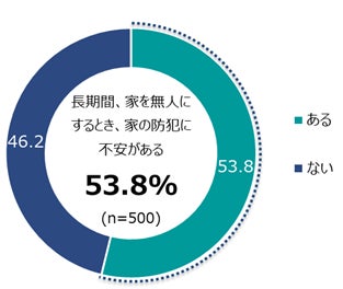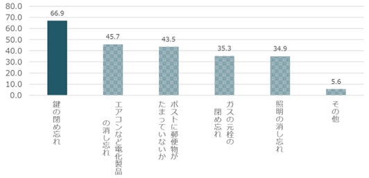 長期の帰省や旅行で家を無人にするときに家の防犯に不安があるか聞いたところ、全体の53.8%は「不安がある」と答えました【図7】。具体的な不安の内容は、「鍵の閉め忘れ」が66.9%で最も多いことが分かりました【図8】。