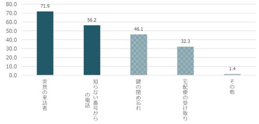 また、在宅時、家の防犯に不安があるか聞いたところ、43.4%は「不安がある」と答えました【図9】。具体的な不安の内容は、「突然の来訪者」(71.9%)が最も多く、次いで「知らない番号からの電話」(56.2%)となりました【図10】。