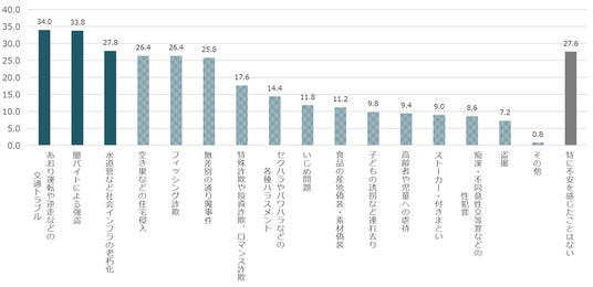 最近1年間で不安を感じた事件・事故のトップ3は、1位「あおり運転や逆走などの交通トラブル」(34.0%)、2位「闇バイトによる強盗」(33.8%)、3位「水道管など社会インフラの老朽化」(27.8%)でした【図3】。共に3割超の「あおり運転や逆走などの交通トラブル」「闇バイトによる強盗」は、2024年に1位だった「フィッシング詐欺」(26.4%)を上回り、体感治安が悪化する要因の1つになったとみてとれます。