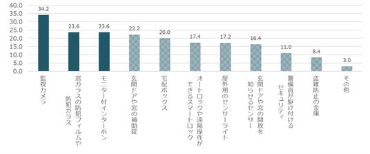 さらに全体で今後、自宅で導入したい防犯グッズは、 1位が「監視カメラ」(34.2%)、2位は同数で「窓ガラスの防犯フィルムや防犯ガラス」「モニター付インターホン」(23.6%)でした【図11】。