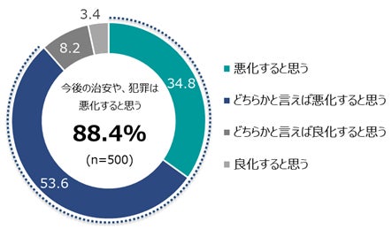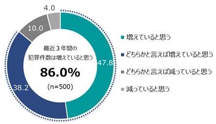 1. 最近3年間の犯罪件数「増えていると思う」は86%。今後の治安や犯罪は88.4%が「悪化すると思う」と回答