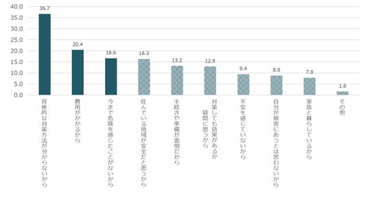 体感治安が悪化する一方、犯罪被害にあわないために日常的に防犯対策を講じているか聞くと63.8%が「防犯対策をしていない」と回答し【図5】、その理由は1位「具体的な対策方法が分からないから」(36.7%)、2位「費用がかかるから」(20.4%)、3位「今まで危険を感じたことがないから」(16.6%)という結果でした【図6】。