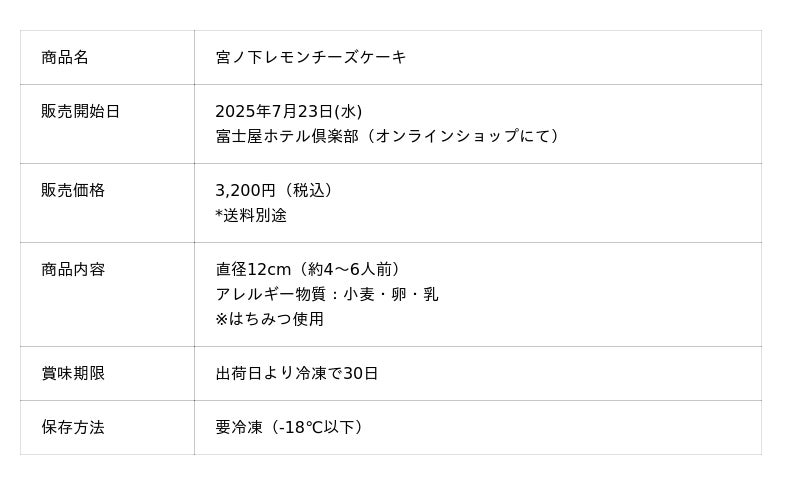 国際興業グループの富士屋ホテル株式会社(本社:神奈川県足柄下郡箱根町宮ノ下359、代表取締役社長:安藤 昭)は、オンラインショップ「富士屋ホテル倶楽部」にて、新作スイーツ「宮ノ下レモンチーズケーキ」の販売を7月23日(水)より開始いたします。「宮ノ下レモンチーズケーキ」は、ノルマンディー地方に伝わるクレームエペス(生クリーム)を贅沢に使用した、富士屋ホテル伝統のベイクドチーズケーキに爽やかなレモンの風味をプラス。小麦粉の使用を最小限に抑えることで、チーズ本来のコクと程よい酸味が引き立ち、夏にぴったりの軽やかな口当たりを実現しました。数量限定での販売となりますので、ぜひこの機会にご賞味ください。
