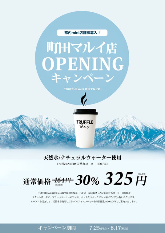 OPEN記念としてTruffleBAKERY天然水コーヒーを30%offでご提供!!【 期間:7月25日(金)~ 8月17日(日) 】