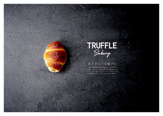 TruffleBAKERY一番人気のトリュフを三段階使用した人気商品です。自家製のトリュフバターを作り生地の中に巻き込み、仕上げにトリュフオイルとフリーズドライの白トリュフとフランス産フルールドセルをかけ香り高く仕上げました。こちらの商品はミニサイズになって外部販売でもお買い求めいただけます。