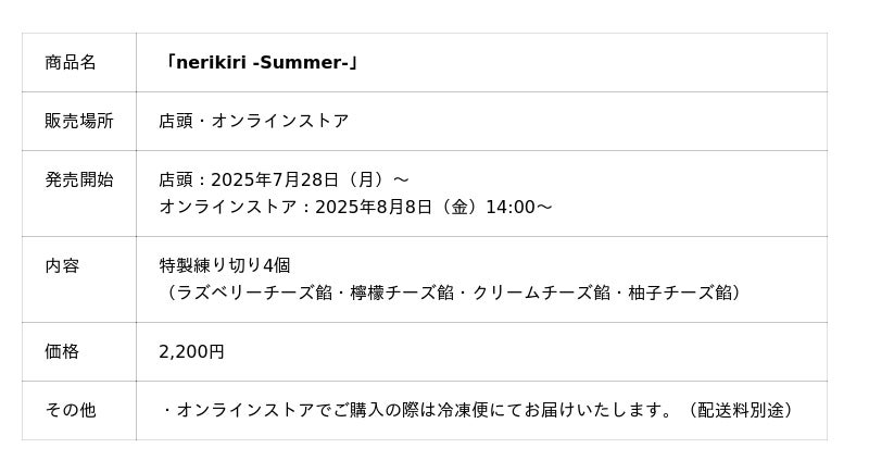 また、特製練り切りの夏の詰め合わせ商品「nerikiri -Summer-」とお茶(茶葉)の販売を店内では7月28日(月)から、オンラインストアでの全国販売は8月8日(金)より開始いたします。