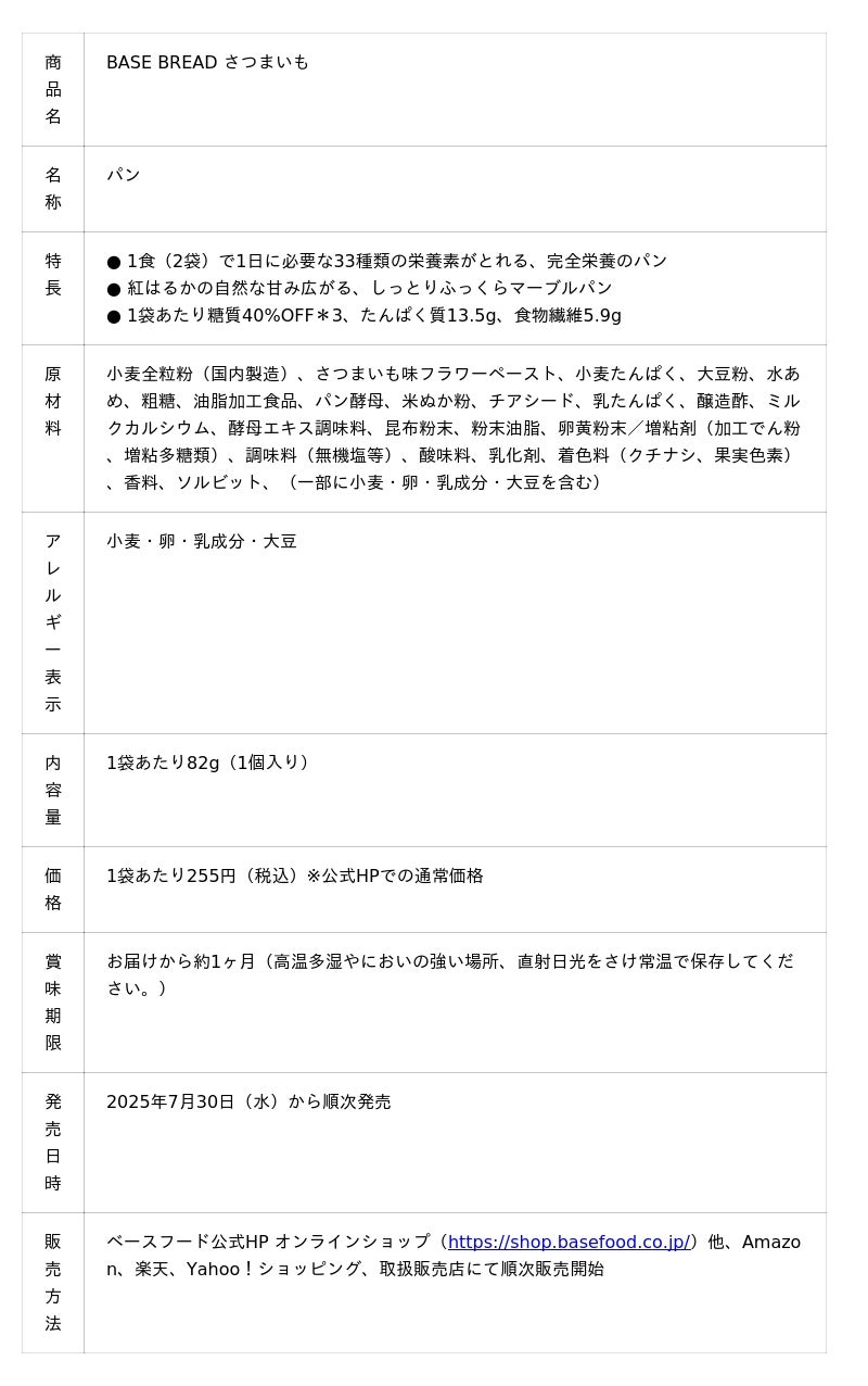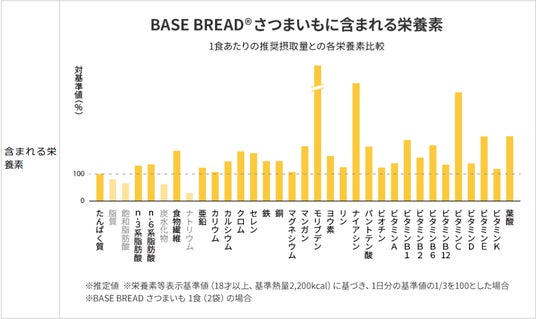 完全栄養の主食※1を開発・販売するベースフード株式会社(本社:東京都目黒区、代表取締役:橋本舜、https://basefood.co.jp)は、1食に必要な33種類の栄養素がすべて摂れる全粒粉ベースの完全栄養のパン※2「BASE BREAD(ベースブレッド)」シリーズから、「BASE BREAD さつまいも」を2025年7月30日(水)より公式オンラインショップ(https://shop.basefood.co.jp/)、他ECサイト、にて順次新販売します。