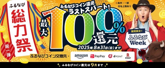 株式会社アイモバイル(本社:東京都渋谷区、代表取締役社長:野口哲也、東証プライム市場)が運営するふるさと納税サイト「ふるなび」( https://furunavi.jp/ )が『最大100%!コイン還元ラストスパート!ふるなび総力祭 第1弾 3つのキャンペーンに事前エントリー&ふるなびアプリでの寄附でふるなびコインがもらえる!』を2025年7月23日(水)12:00より開始しました。