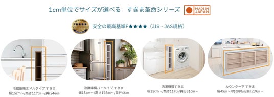 1センチ単位からのオーダー収納家具や完成品家具など、高さ・奥行・カラーなど豊富なサイズバリエーションを取揃えています。また、シックハウス症候群の原因となるホルムアルデヒドの放散量が最も少ない、最高基準のF★★★★(エフフォースター)家具シリーズも取揃えていますので、お子さまやアレルギーのある方も安心してお使いいただけます。