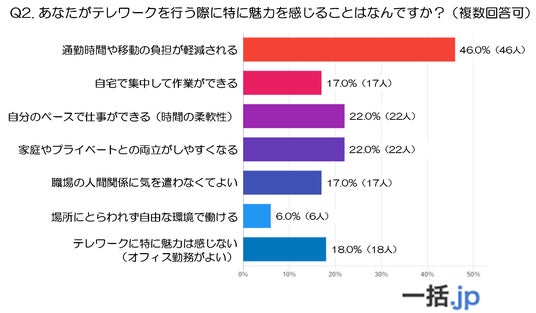- また「テレワークに特に魅力は感じない(オフィス勤務がよい)」と回答した人も18.0%(18人)おり、全体の約2割はオフィス勤務の方が自身に合っていると感じていることがうかがえます。