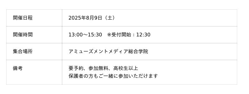 ゲームが好きでゲームクリエイターやシナリオライターなどの職業に関心のある方、3DCGを使う業界に興味のある方、また夏休み中に進路を決めたい高校3年生も、ぜひご参加ください。
