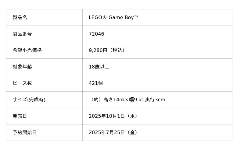 レゴジャパン株式会社(代表取締役社長:マイケル・エベスン/東京都港区)は、ゲーム史に革新をもたらした任天堂株式会社の携帯型ゲーム機「ゲームボーイ(TM)」をレゴ(R)ブロックで精巧に再現した「LEGO(R) Game Boy(TM)」を2025年7月25日(金)午前10時より先行予約を開始し、2025年10月1日(水)より一般販売します。(※一部店舗により予約販売の日時が異なります。レゴ(R)公式オンラインストアは、25日午前0時より予約販売を開始します。)