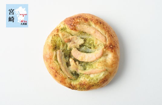 九州Pizza ゆず胡椒バジル(チキン) 価格:360円(税込388円)粉に水分を抱き込ませた、多加水生地のもちもち食感ピッツァ。バジルソースに柚子胡椒を合わせ、チキン・オニオン・パルメザンチーズをのせて焼き上げました。バジルの清涼感とゆず胡椒の辛味のアクセントが絶品です。