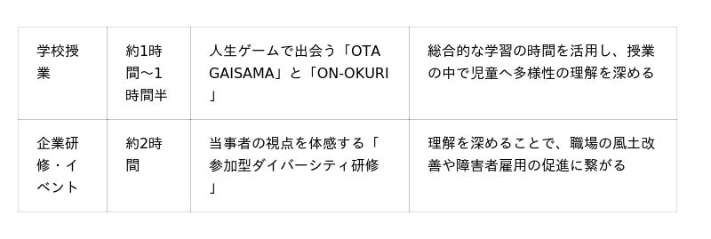 オタガイゴト体験共感プログラムは、【1.当事者による講演 →2. 人生ゲーム型ボードゲームによる擬似体験→ 3.参加者同士の意見交換】の3段階で構成されており、<病気や障がいは特別なものではないこと><病気や障がいを抱えても人生は終わりではなく、誰もがそれぞれの困難を抱えて生きていること>を共有し、「どうしたらお互いに支え合える関係を築けるか」を考える機会として、全国に展開していきます。