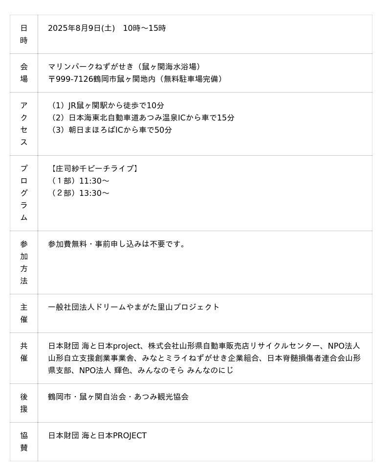 一般社団法人 ドリームやまがた里山プロジェクトは、2025年8月9日(土)に「ユニバーサルビーチフェスティバルinねずがせき」を開催いたします。障がい者も健常者も一緒に楽しむことができるイベントです。このイベントは、次世代へ豊かで美しい海を引き継ぐために、海を介して人と人とがつながる"日本財団「海と日本プロジェクト」"の一環です。
