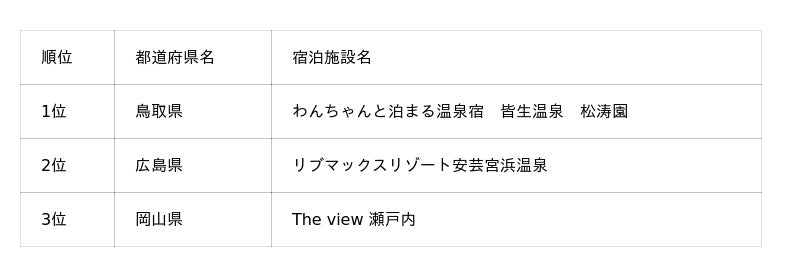 そのほか、今回新たに上位にランクインした施設もあり、四国エリアでは初登場ながら1位となった「オーシャンドッグリゾート父母ヶ浜」、北関東エリアでは「亀の井ホテル塩原 わんちゃんの宿」が3位に入りました。「亀の井ホテル塩原 わんちゃんの宿」は、2025年2月1日に"わんちゃんと泊まれる宿"としてリニューアルしたばかりにもかかわらずランクインしており、注目施設といえるでしょう。