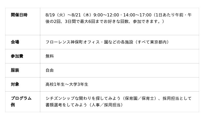 認定NPO法人フローレンス(東京都千代田区、代表理事:赤坂緑)は、こどもに関わる全ての仕事に関心のある高校1年生から大学3年生の学生を対象に、イベント「キャリアパレット2025~ようこそ、こどもと社会を支える仕事へ~」を、2025年8月19日(火)~8月21日(木)の3日間、東京都内の各施設(神保町オフィス・保育園など)で開催します。