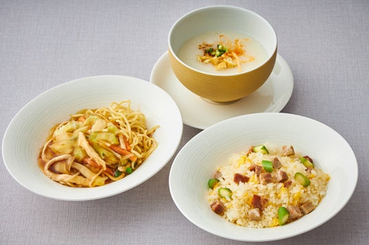 選べる主菜6種類のうち、桂林の伝統メニュー「麻婆豆腐」と海老を使った料理の2種類は常時ラインアップしています。その他の4種類は隔週で替わり、その時々の味覚を織り交ぜ、季節感を味わえるメニューをご用意いたします。素材はお肉、魚介、野菜を使用し、調理方法も炒め、揚げ、蒸しなど、どれを選んでも偏りなく様々な味をバランスよくお召し上がりいただけます。お食事は焼きそば、炒飯、お粥の3種類からお選びいただけます。自分好みに組み合わせたり、ご一緒にお食事する方とそれぞれ違うメニューを頼んでシェアしていただいたり、より多くの味わいをお楽しみください。