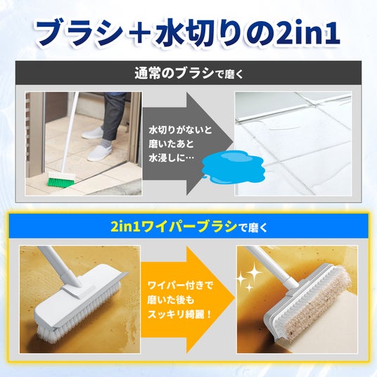 ブラシで擦った後の水浸しの床も、ブラシの裏の水切りワイパーで一気に仕上げ!