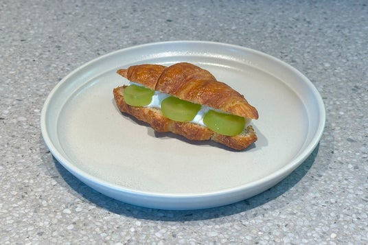 トップには、シャインマスカットとクレーム・シャンティを挟んだ、ミニクロワッサンサンドを添えています。クレーム・シャンティにはプラムリキュールを加え、ほんのりとプラムのフルーティで芳醇な香りを効かせました。