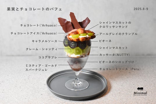 株式会社βace(東京都渋谷区、代表取締役:山下貴嗣)が展開する、日本発のスペシャルティチョコレート専門店 「Minimal - Bean to Bar Chocolate - (ミニマル)」( https://mini-mal.tokyo/ ) は、ジューシーな2種のぶどうが主役の「果実とチョコレートのパフェ -シャインマスカットとピオーネ-」を2025年8月2日よりPatisserie Minimal 祖師ヶ谷大蔵店にて期間限定で販売します。