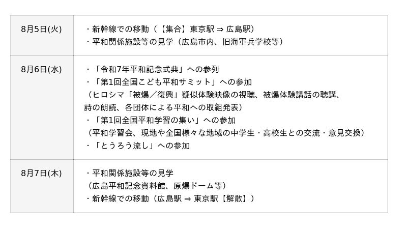 その一環として、戦後80周年・さいたま市平和都市宣言20周年の節目に、市内在住の中学生10名を被爆地広島へ派遣し、被爆の実相に触れて戦争や原爆被害を実感するとともに、平和記念式典への参列など現地でしかできない体験をしながら、平和の尊さや大切さを考えていきます。