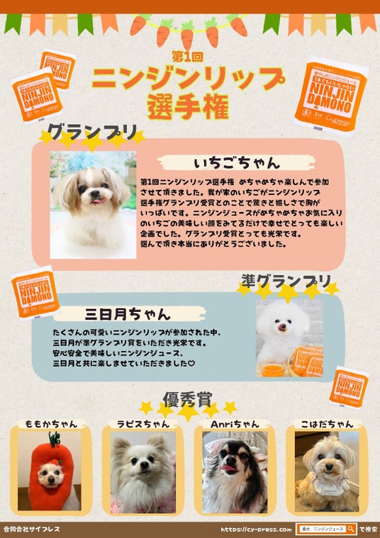 「ニンジンリップ選手権」は、ニンジンジュースを飲んだあとの愛犬の"可愛らしい口元"の写真をInstagramに投稿し、最もキュートな投稿を「グランプリ」「準グランプリ」「優秀賞」として表彰するユーザー参加型イベントです。ユニークで心温まる企画として、多くの愛犬と飼い主の皆さまにご参加いただきました。