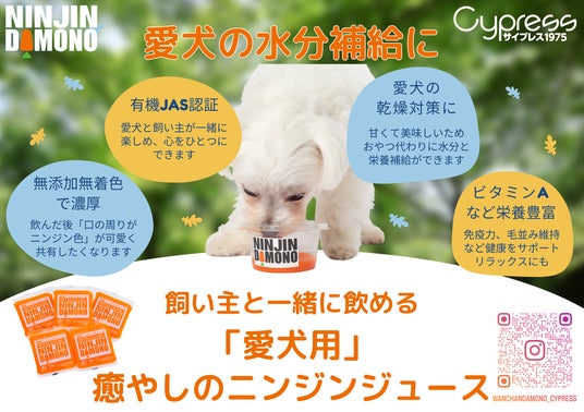 ニンジンジュース【 NINJIN DAMONO 】を通じて、愛犬と飼い主がともに楽しめる"健康的で豊かなライフスタイル"の提案を続けてまいります。