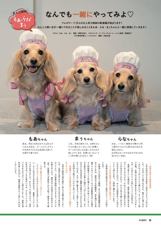 撮影スタジオでは、美人三姉妹犬の「もあちゃん・らなちゃん・まぅちゃん」が仲良く楽しみながら撮影に参加。出来上がったニンジンパスタも、仲良く完食してくれました。
