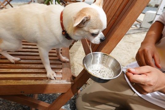 竹を流れるそうめんをじっと見つめるわんちゃんたちや、飼い主から手渡されたそうめんを美味しそうに味わう姿が印象的。