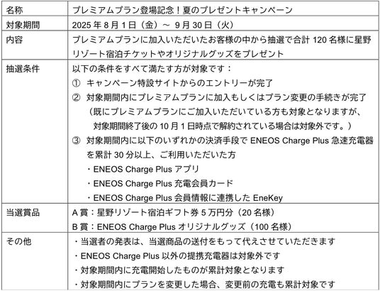 ENEOS株式会社(以下、「ENEOS」)は、2025年8月1日(金)から9月30日(火)までの間、ENEOSが提供するEV充電サービス「ENEOS Charge Plus」において、「プレミアムプラン登場記念!夏のプレゼントキャンペーン」※1(以下「本企画」)を実施しますので、お知らせいたします。