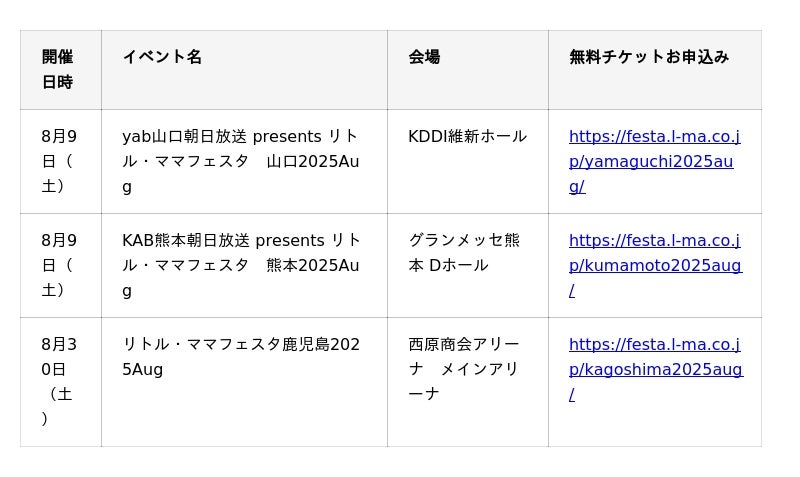 【無料】山口・熊本・鹿児島で今話題のファミリーイベント開催♪ママパパに選ばれる"夏の親子イベント【リトル・ママフェスタ】へ