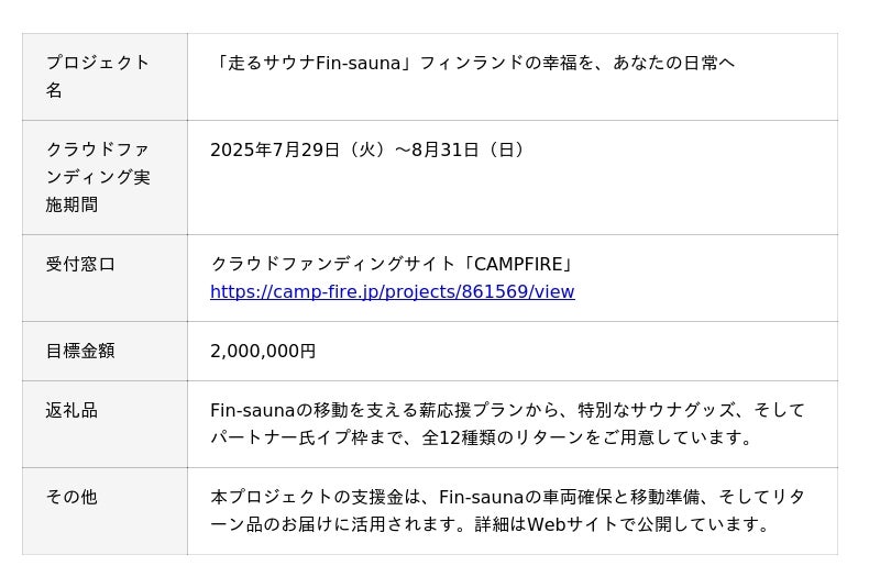 「フィンランド人がサウナで必ず使っている物をお届け」をコンセプトにサウナグッズ・アクセサリーを取り扱う株式会社キャックルコム(本社:埼玉県川越市、代表:吉田 成晩)は、フィンランドのトレーラー・サウナメーカーと共同で移動式サウナを日本向けに開発する「走るサウナFin-sauna」プロジェクトを立ち上げ、その運営資金をクラウドファンディングサイト「CAMPFIRE」にて募集を開始しました。募集期間は2025年7月29日(火)から8月31日(日)で、募集金額は200万円を目指します。