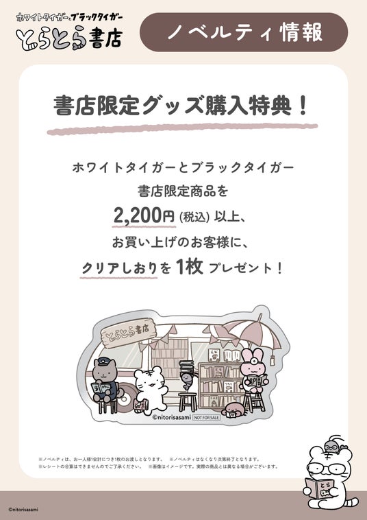「ホワイトタイガーとブラックタイガー とらとら書店」フェアでは、書店限定グッズを2,200円(税込)以上お買い上げのお客様に、ノベルティとして本フェアの描き下ろしアートを使用したクリアしおりを1枚プレゼントいたします。