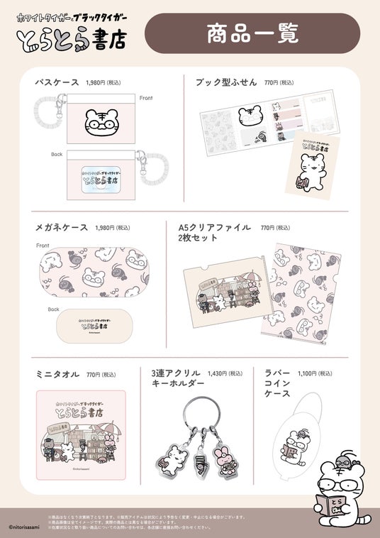 商品ラインナップは、パスケース、ブック型ふせん、メガネケース、A5クリアファイル2枚セット、3連アクリルキーホルダー、ラバーコインケース、ミニタオルの全7アイテム。ホワイトタイガーとブラックタイガー書店限定グッズを税込2,200円以上のお買い上げで、描き下ろしアートを使用した「クリアしおり」を1枚プレゼントいたします!