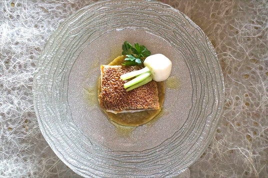 白身魚を香ばしく焼き上げ、特製の焼きナスソースで仕上げた一皿。