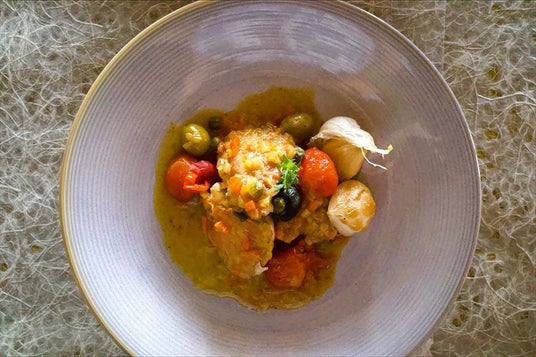 チキンとトマト、香味野菜、オリーブ、松の実を煮込んだ、風味豊かな一皿。