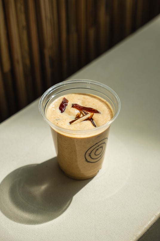 ■ ハルワ&デーツミルクシェイク UAEの伝統菓子「ハルワ」は、サフランで風味付けされた芳醇な甘さが特徴です。そのハルワに、栄養豊富なカラスデーツを贅沢に組み合わせたのが本ドリンク。まるで"飲むスイーツ"のような特別感のある一杯に仕上がっています。ハルワにデーツを合わせるスタイルはUAE国内でも非常に珍しく、ここでしか味わえないオリジナルです。