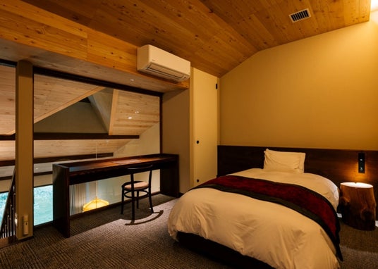 【その 1:カラマツに"触れて過ごす"】天井や壁面、家具や巾木にいたるまで、客室の随所に地域産のカラマツ材を使用しています。やさしい木の香りやあたたかな手ざわりが、滞在に深い安らぎをもたらします。