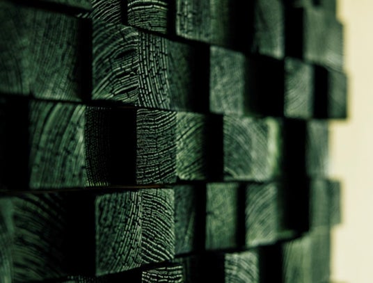 【その 2:カラマツを"見て感じる"】室内壁面には、焼きカラマツのアートウォールがあしらわれています。カラマツの表面を焼き、木肌の表情を浮き立たせた印象的な作品。カラマツの素材そのものを間近で感じることができます。