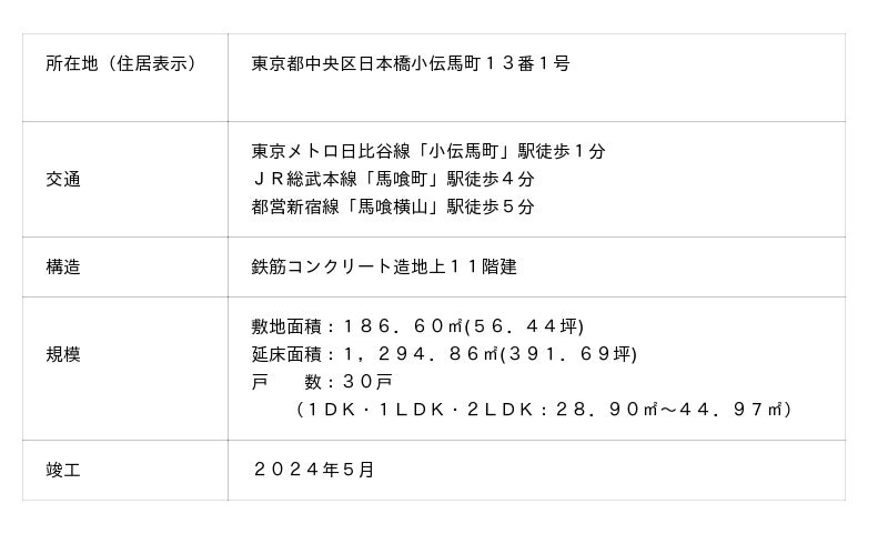 本物件は、2024年5月に竣工した地上11階建、1DK・1LDK・2LDKタイプの間取りで構成する総戸数30戸の賃貸レジデンスで、東京メトロ日比谷線「小伝馬町」駅徒歩1分、JR総武本線「馬喰町」駅徒歩4分、都営新宿線「馬喰横山」駅徒歩5分等、8駅6路線が利用可能な利便性の高い立地に存しています。各路線を利用することで都心のビジネスエリアへの接続が良好であるほか、飲食・物販を中心とした商業施設が充実している「三越前」駅、「人形町」駅周辺も徒歩圏内で利用可能であり、職住近接を志向する単身者やDINKsをターゲットに、現在安定的に稼働しています。
