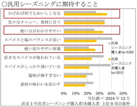 お客さまの節約意識が高まるなか、幅広い食材・メニューに使用できる汎用シーズニングは、家にある食材を賢く活用するシーンと親和性が高いアイテムとして、市場拡大の可能性があると推察されます。また、汎用シーズニングに対しては、「かければ何でもおいしくなる」「使い方がわかりやすい」などの簡便性や、使い切りやすい容量が求められています。