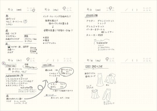 毎日のスケジュールは、マンスリー・ブロックでしっかり管理。フリーのデイリーページは、書きたい日だけ自由に使えるので、気が向いた時に気軽に書き留められます。一言日記、メモ、趣味の記録、健康管理など、使い方はあなた次第。