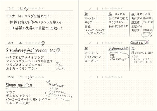 ▲フリー・ディリー:日付が入っていないので、書きたい日だけを記入。一言日記やメモ、趣味や健康管理の記録におすすめです。