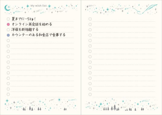 ▲ウィッシュリスト:夢や願いを30個までリストアップし、実現に向かって行動しやすくなります。叶ったら左の丸に色を付けます。
