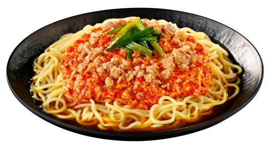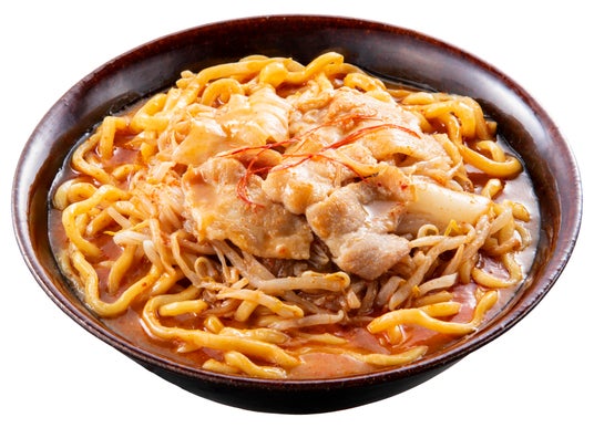 豆板醤,カイエンペッパー,花椒を炒めて辛味と旨味を引き出した、痺れる辛さとコク深い旨味が特長のスープで、モチモチとした幅広の麺を味わう商品です。