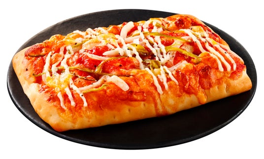 ボリュームのあるふんわり食感のパン生地に、唐辛子入りのピザソース、オニオン、ピーマン、チーズを載せた、夏の食欲を刺激するピリ辛な惣菜パンです。