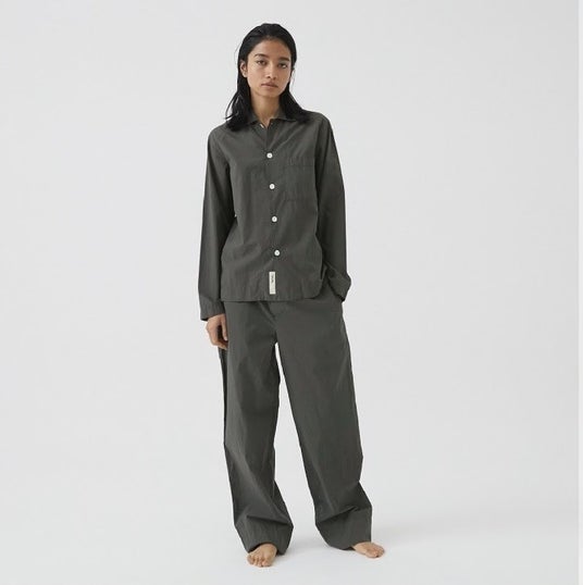 「hoteL_」ロングスリーブシャツ 27,500円 素材にこだわり抜いた、ビンテージライクな風合いが魅力のパジャマ。軽くて上質なコットン素材で、洗うたびに風合いと愛着が楽しめる一着です。身体の動きを妨げないシルエットで、汗をしっかり吸収し、快適な睡眠をサポート。休日や旅先でもワンマイルウェアとしても活躍するアイテム。