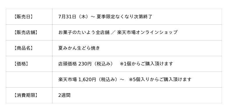 株式会社太陽社(所在地:千葉県匝瑳市飯倉293、代表取締役:片岡正裕)が展開する千葉県で長年愛される菓子店「お菓子のたいよう」は、夏の大人気商品「夏みかん生どら焼き」を、夏限定・数量限定で7月31日(木)より今年も販売いたします。「夏みかん生どら焼き」は、夏しか味わえない特別な逸品です。毎年、瞬く間に完売してしまうため、ぜひお早めにお買い求めください。